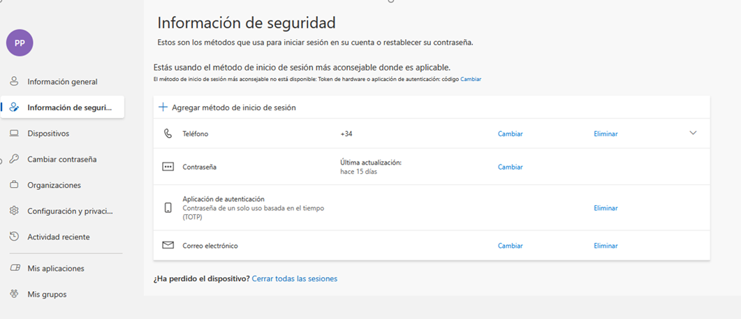 Clicando sobre Información de seguridad, tienes disponible la información sobre el método de recuperación de contraseña que configuraste al activar la cuenta. Desde este apartado puedes modificar, eliminar o añadir otro método.