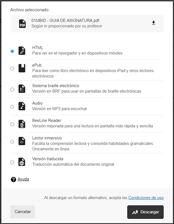 Esta novedad permitirá que se pueda acceder a estos contenidos por medio de los siguientes formatos alternativos: HTML, ePub, sistema braille electrónico, audio, BeeLine Reader, lector inmersivo y versión traducida.