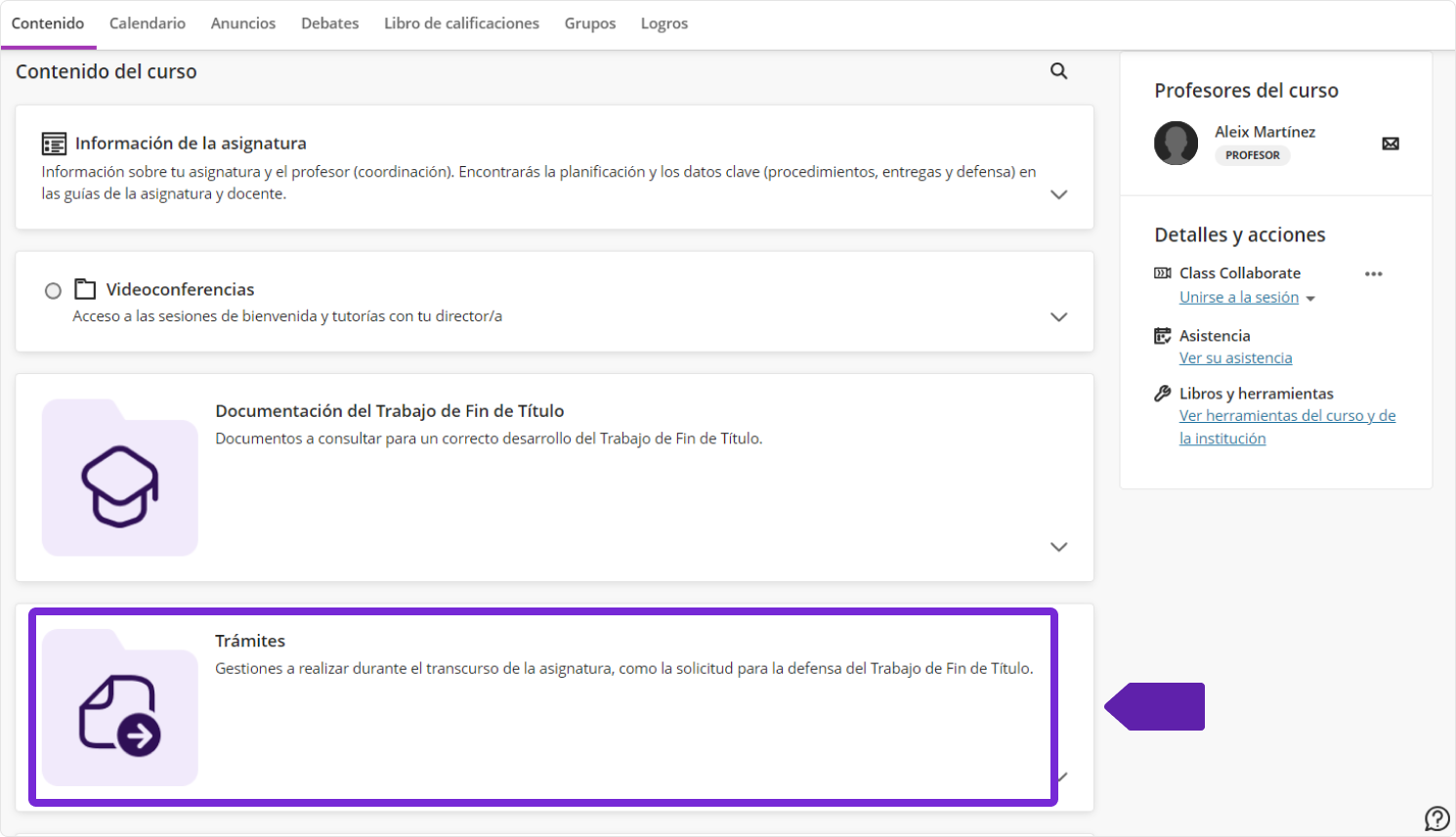 En la carpeta Trámites del Trabajo de Fin de Título encontrarás las diferentes solicitudes que deberás cumplimentar a lo largo de la asignatura, desde la propuesta del tema hasta la autorización para depositar el trabajo. Si tu titulación tiene la modalidad grupal, verás esta indicación junto a cada documento.
