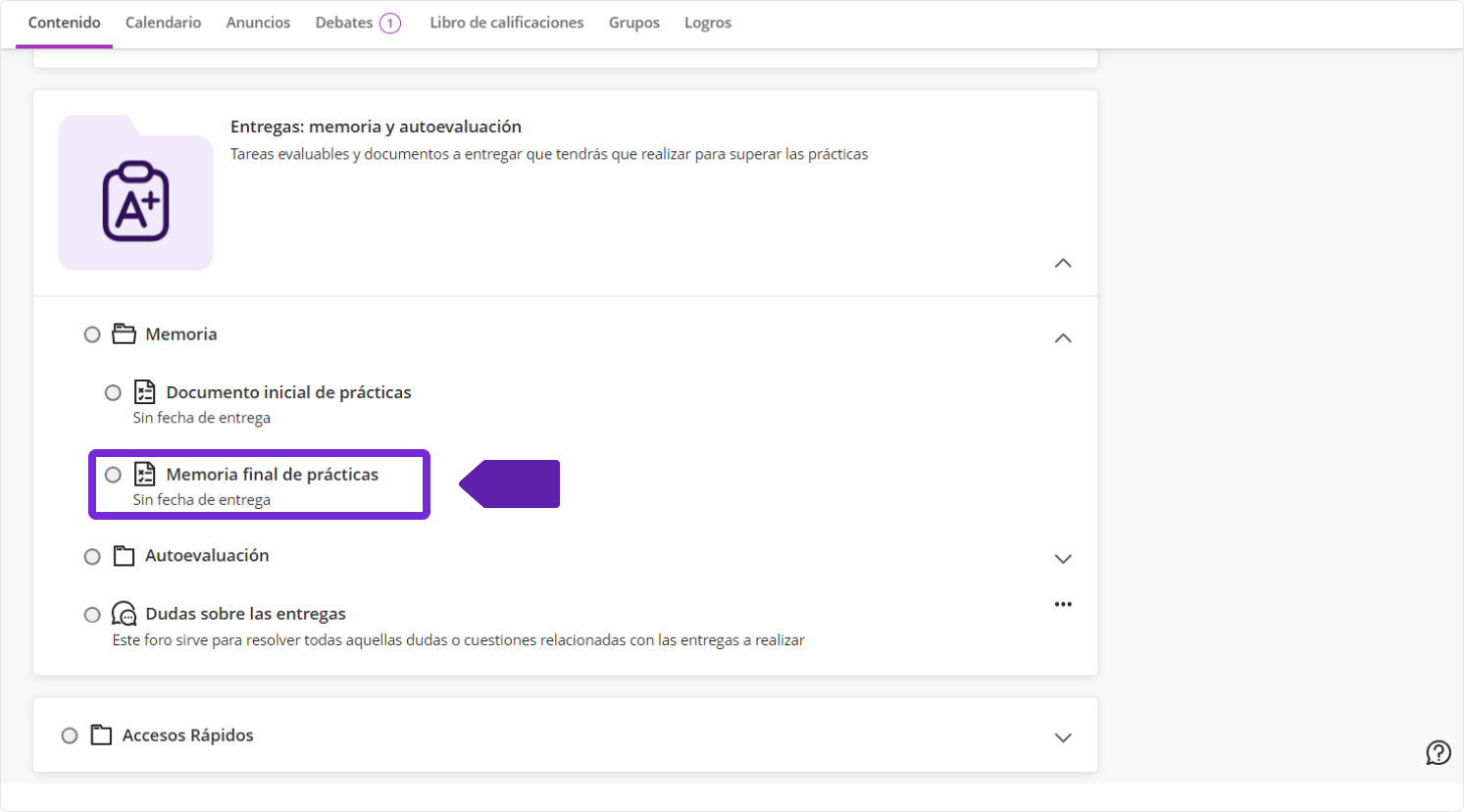 Encontrarás la plantilla para su cumplimentación en el Aula de prácticas, en la carpeta Entregas: memoria y autoevaluación > Memoria.