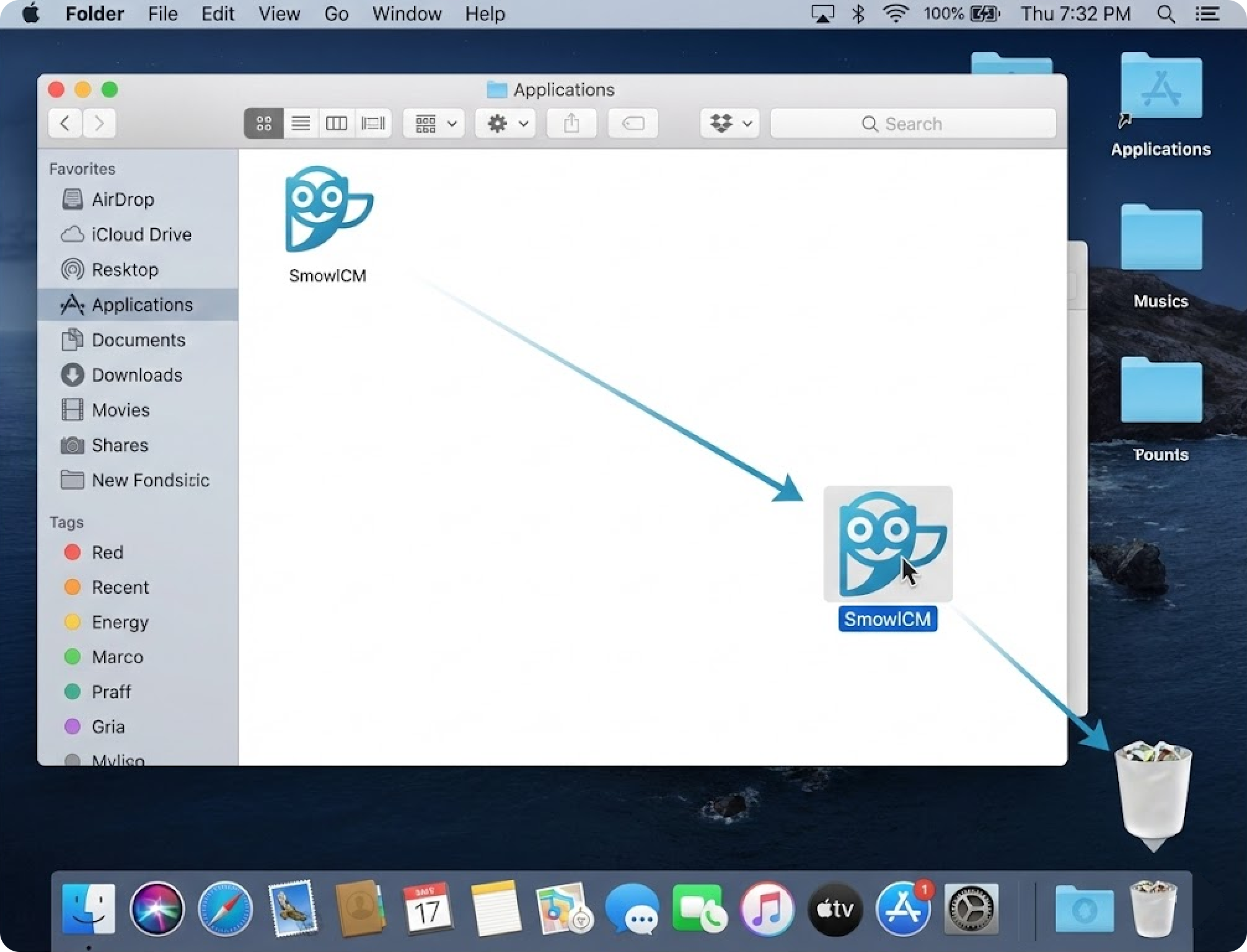 Una vez descargado, busca el archivo de SmowlCM en tu carpeta de Descargas y arrástralo hasta la carpeta de “Applications/Aplicaciones" y espera a que finalice la instalación.