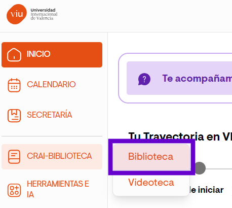 Para buscar un libro o artículo en la Biblioteca de la Universidad Internacional de Valencia, lo primero que hay que hacer es acceder al apartado del Campus CRAI > Biblioteca.